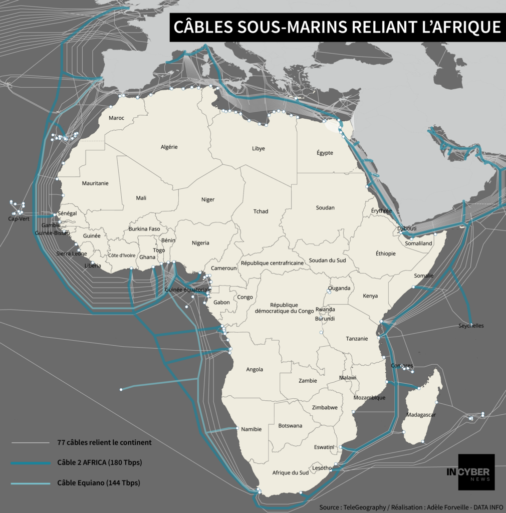 77 câbles sous-marins relient aujourd’hui l’Afrique au monde, assurant plus de 99 % de sa connectivité internationale. Cette expansion masque toutefois un transfert massif de contrôle infrastructurel : les géants américains du numérique (Google, Meta, Microsoft et Amazon) possèdent désormais près de 50 % de la bande passante sous-marine mondiale, une concentration sans précédent qui redessine la géopolitique des câbles.